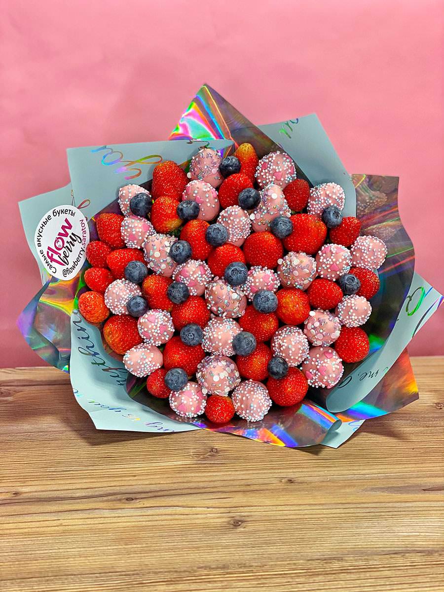 Свежая клубника + клубника в бельгийском шоколаде марки — Callebaut в вашем букете. Для полноты вкуса и эстетики наши флористы добавили голубику, wow-эффект !