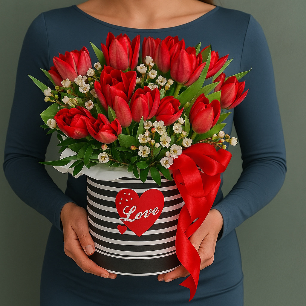 Насыщенные алые тюльпаны в стильной коробке – символ страсти и искренних эмоций. Отличный выбор для признания в любви или романтического вечера.