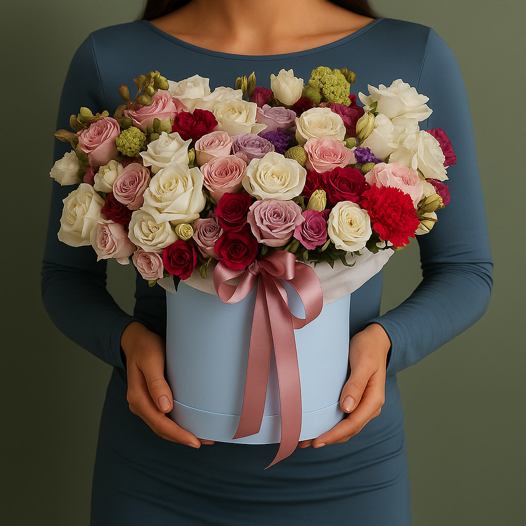 Яркая и многообразная композиция из множества оттенков роз подарит море эмоций и станет центром внимания на любом празднике. Отличный выбор для юбилея или свадебного торжества.